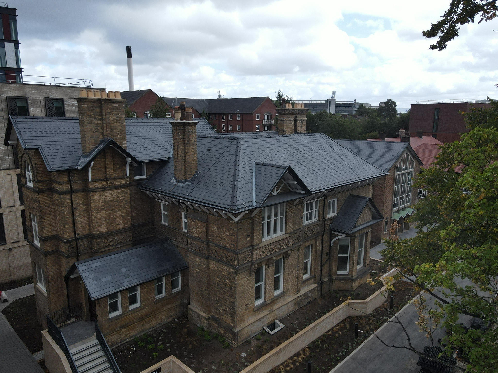 Material handling was another significant factor. With very limited on-site storage, they had to plan and manage the phased delivery and installation of over 19,000 natural slates, not to mention a further 66,000 Rosemary tiles used on the adjacent Woodthorpe building. Efficient stock control and delivery became critical to keeping the works on track without overloading the site.